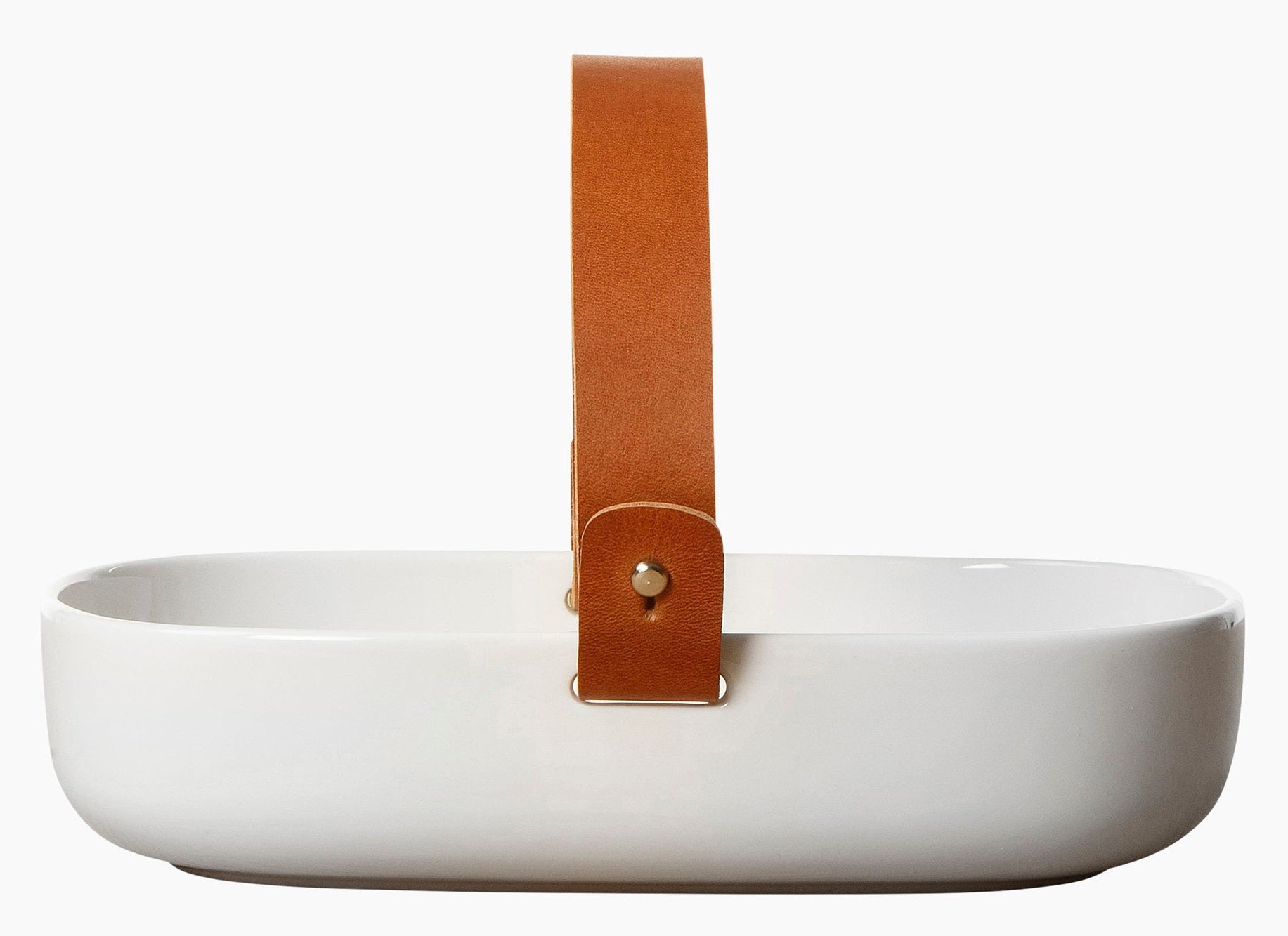 A white stoneware serving dish with a detachable leather handle.