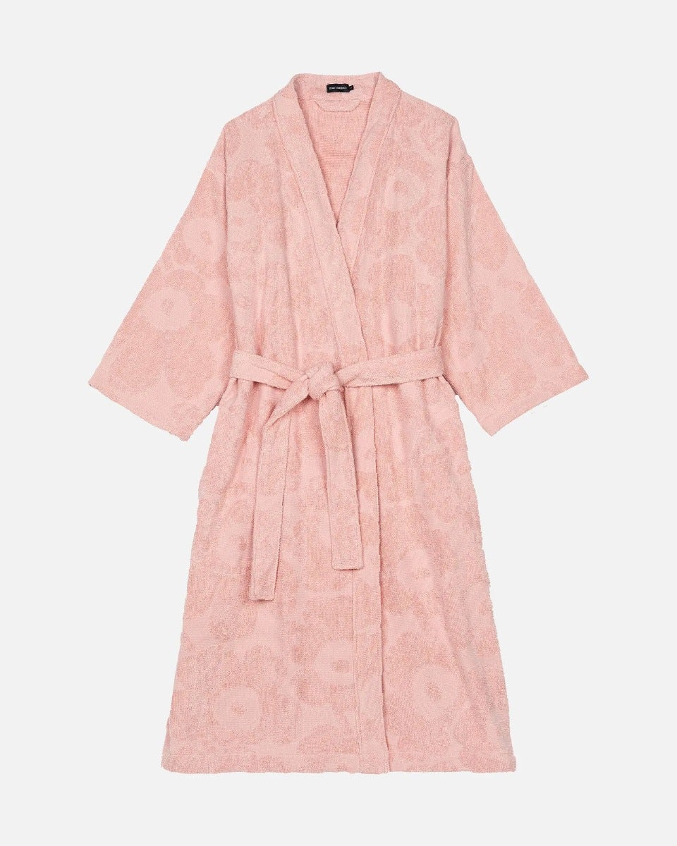 This organic cotton terry bathrobe is decorated with the Pieni Unikko pattern. The robe has large pockets in the front and a detachable belt.