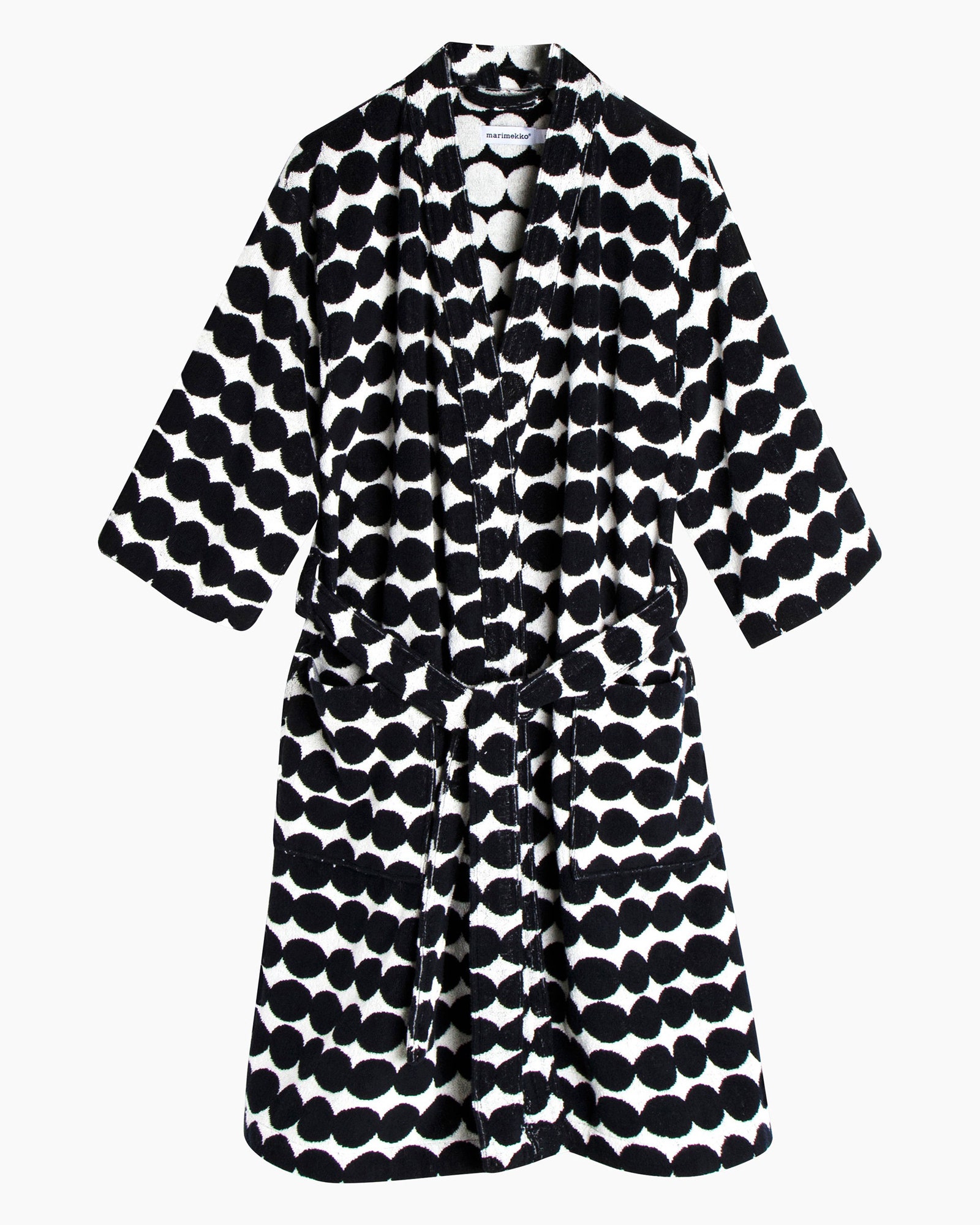 This thick and comfy cotton terry bathrobe is decorated with a black and white Räsymatto pattern. The robe has large pockets in the front and a detachable belt. The inside of the robe is a color negative of the outside, giving the robe a playful look.