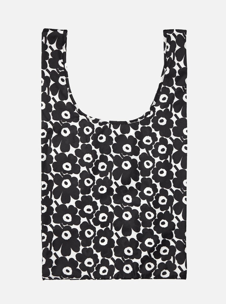 The Smartbag is made of polyester in the Unikko pattern. When not in use, the bag can be folded up and stored in the inside pocket.