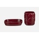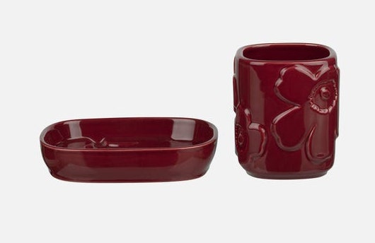 This bathroom accessories set includes a container and a soap dish, both with the embossed Unikko pattern. The colored glaze may give the item a lively color. The set is packed in the Marimekko Logo pattern box.