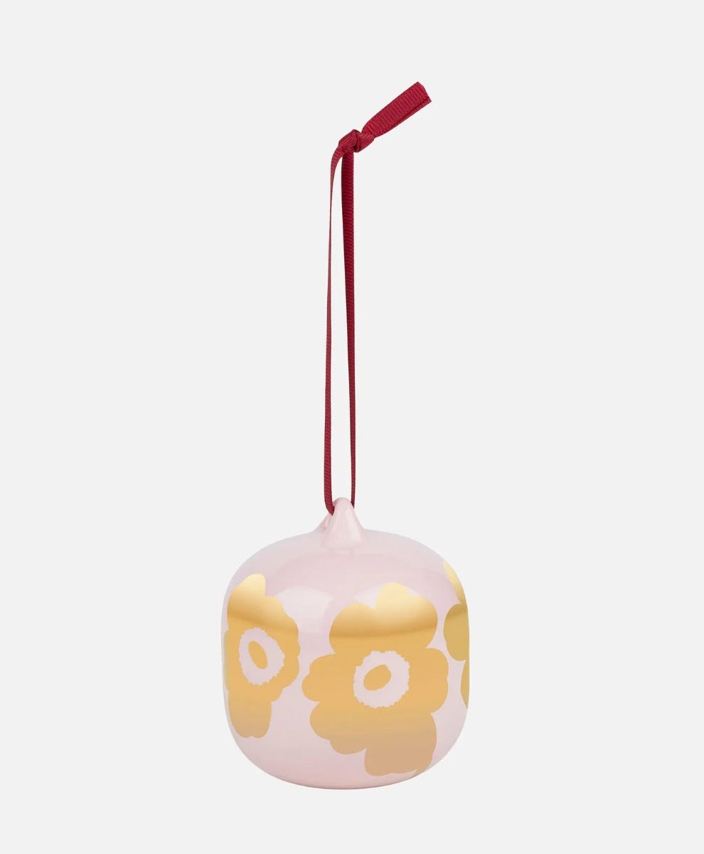 This collectible ornament features the golden metallic pigment Unikko pattern. The ornament features the Marimekko stamp with the year of production on the bottom. The collectible ornament is made of ceramic with a pink glaze.