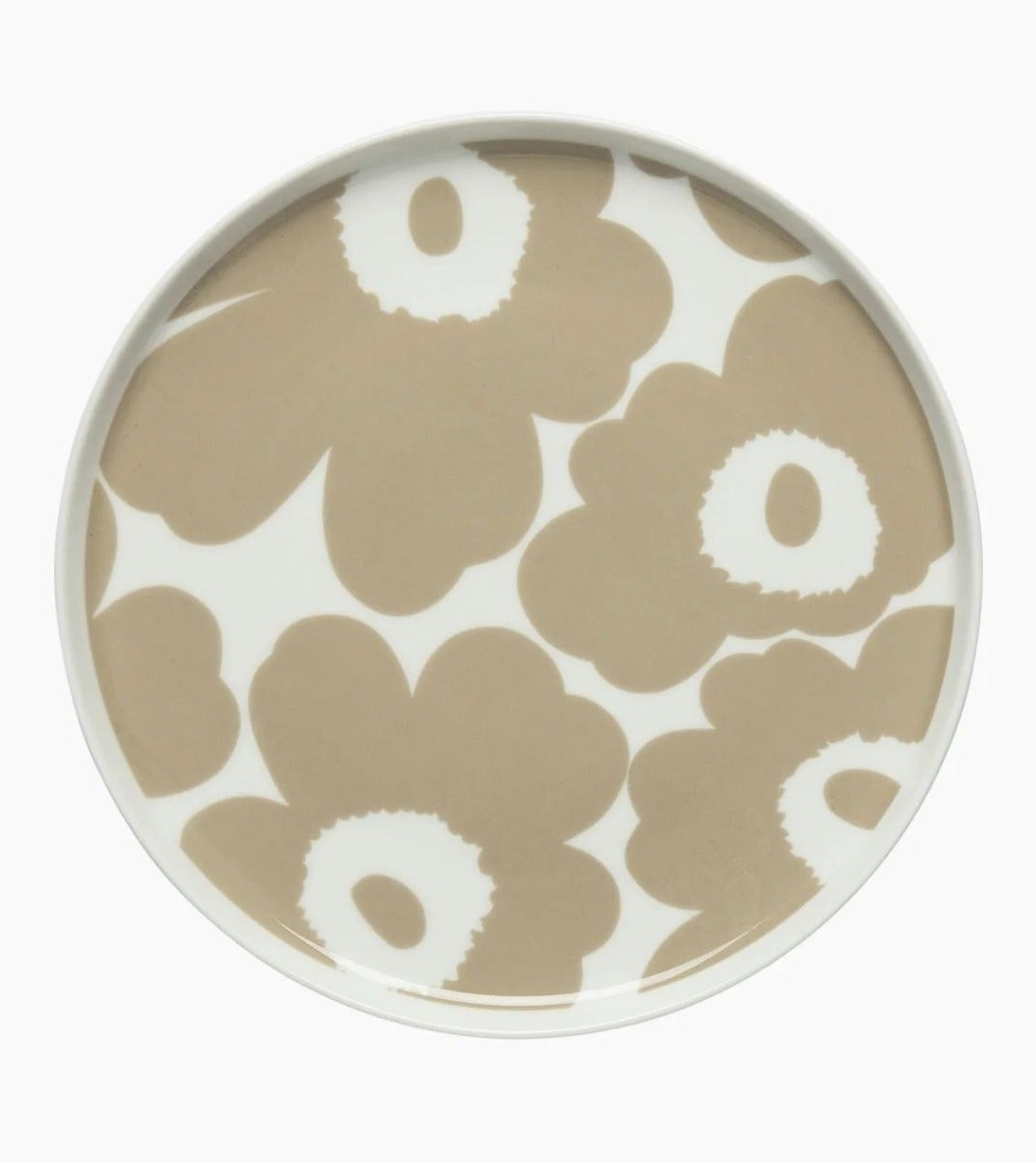 The Oiva plate features the white and beige Unikko (poppy) pattern and it is made of dishwasher, oven, microwave and freezer safe white stoneware.