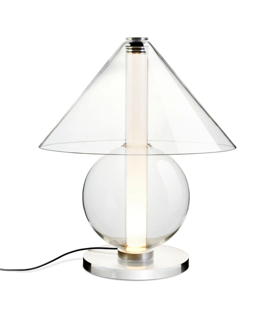 Fascinated by timeless design, designer Jaume Ramírez is interested in the archetypal table lamp in which a lampshade distributes light in all directions. This is the starting point from which he reflects and experiments to propose a new glass design, with more streamlined shapes. The Fragile lamp is a mix of geometric shapes. A cone and a sphere are arranged to hold a cylinder that emits ambient light from below.