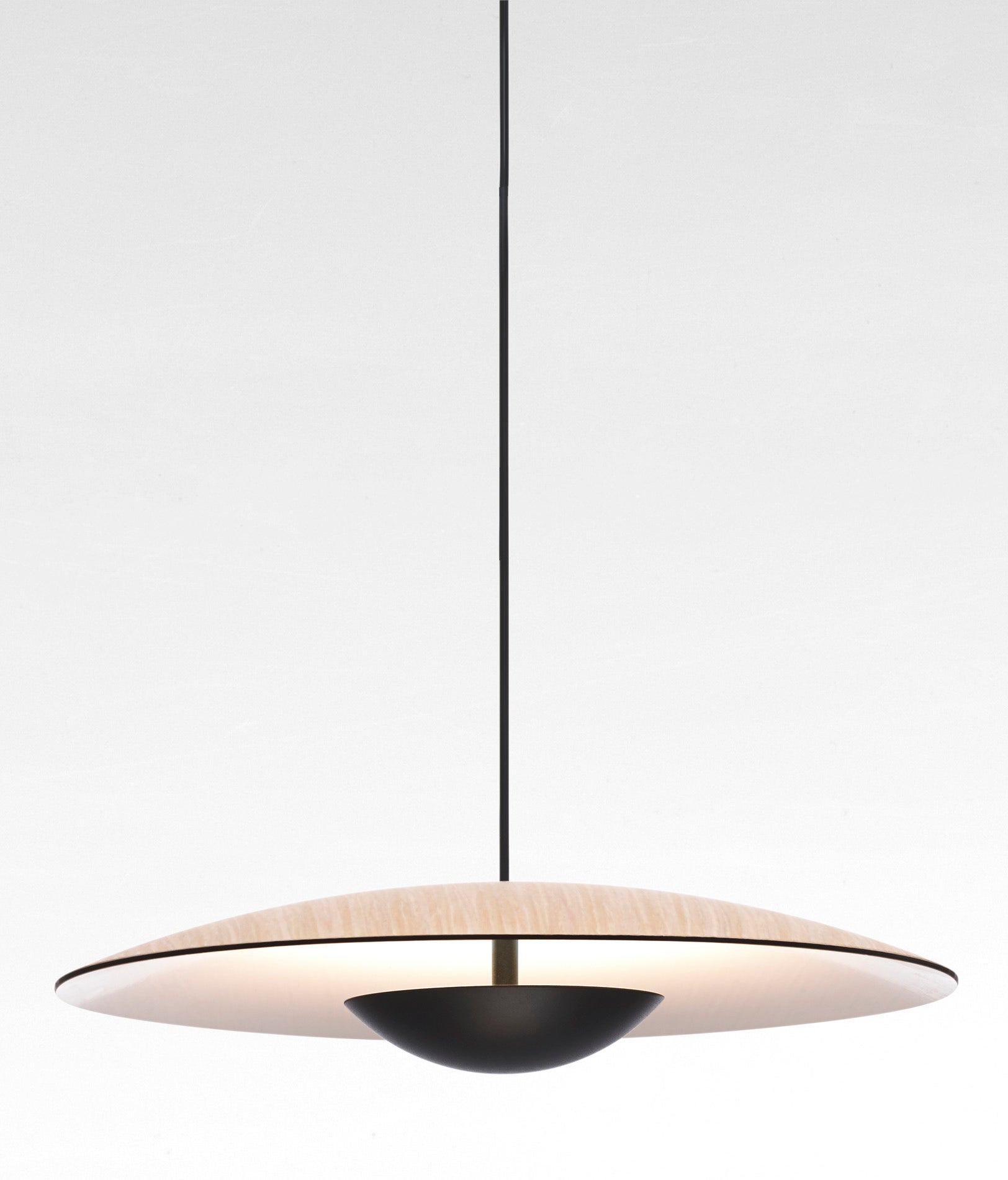 Wood is a great ally of cozy lighting. It is a material that is hard to mold, a challenge that the Ginger collection neatly resolves. The combination of sheets of wood and paper pressed together under high pressure achieves a laminate that appears almost entirely flat, which discreetly lights up spaces with indirect light.