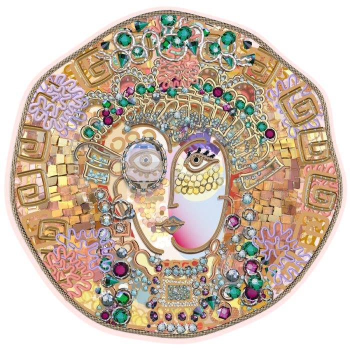 A giant carpet a rich print of a textile mosaic presenting the IKONA of Theodora the richest Byzantine Empress loving overdressing with jewelry and fashion accessories of her times!