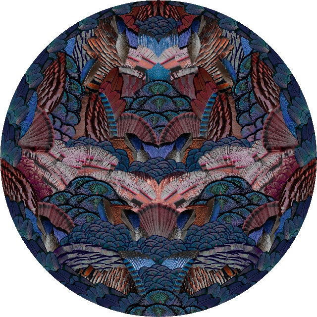 The male would move back and forth in a rhythmic dance, the blue hues of his ornate collar feathers shining in the sun. The female would respond by fanning her tail feathers that ended in what resembled graceful calligraphy swirls, writing her very own colourful love message. This circular carpet safeguards the poetic beauty of the birds’ courtship, making it eternal.