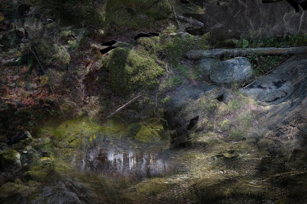 A collage composed of paintings, sketches, 3d scans and photographs from our sketchbook depicting the forest floors. It makes you happy when you take a walk outside into the woods where you see, feel and smell the different layers that are so typical for a forest wherever you are. Even studies suggest that people simply feel good when they see various aspects of nature at the same time. You instinctively understand what you see and you will always remember how fresh moss looks on a branch or stone, how trees reflect in a puddle of rain and how fallen leaves create a beautiful blanket of forest floors. With this carpet design we combined a variation of forest floors in one carpet so you can take that positive feeling you get from nature, inside your interior. So you will feel good inside your house, office or hotel even if a forest is far away.