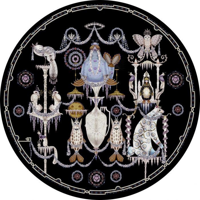 The Polar Byzantine is a series of rugs based on an original poetic story written by award winning Finnish Author Rosa Liksom. Together with Klaus Haapaniemi they are also planning and staging the story and the fantastical arctic world into an opera where the animals escape the transforming nature into an Ice Palace far away from the earth.