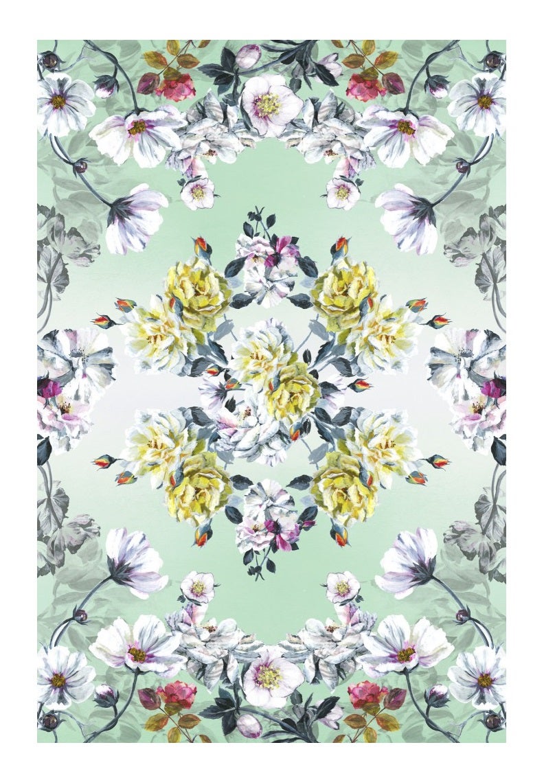 Inspired by golden age of couture, exquisite painterly roses on a grand scale feature in this beautiful digitally printed floral rug. Inspired by the Designers Guild linen fabric of the same name, the kaleidoscopic layout bursts with vibrant colour and a cool mint green background creates a dramatic contemporary statement for your interior.