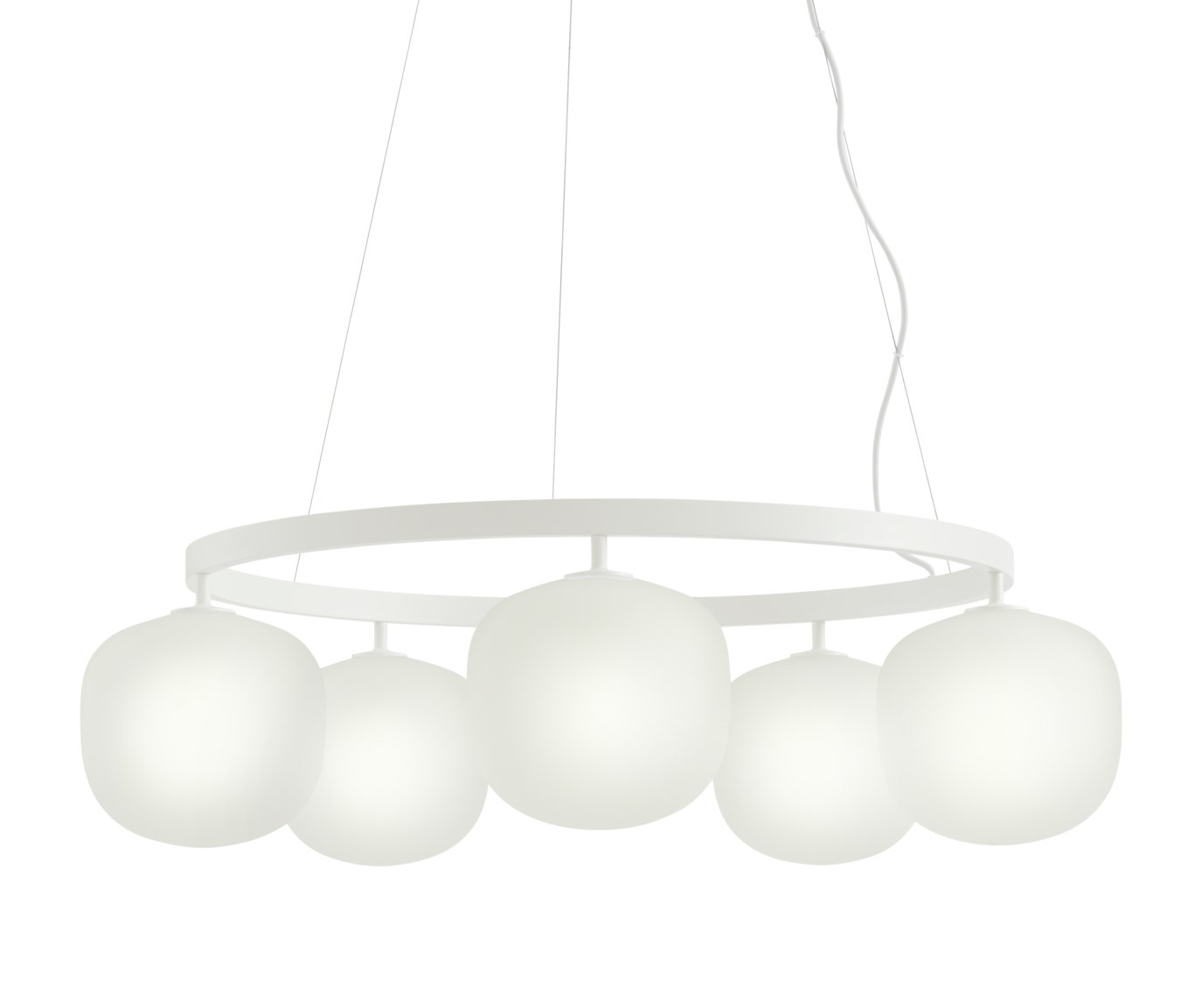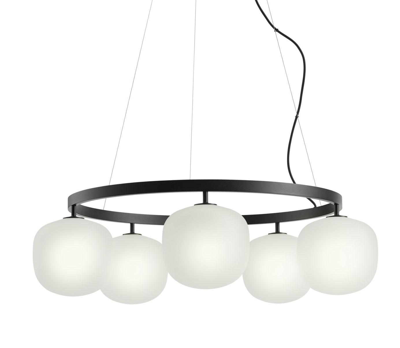 Rime Chandelier reimagines the classic glass pendant as a striking light sculpture. Featuring five mouth-blown, sandblasted glass shades, it casts a soft, refined glow while its square-profile aluminum suspension adds sharp, architectural contrast. Designed for high ceilings, it makes a bold statement above round tables and dining areas. Visible screws and industrial finishes highlight its modern character. Each shade includes a high-quality G9 bulb with a color rendering index above 90 for warm, consistent illumination. Glass shades, suspension, and cables can all be replaced for lasting durability.