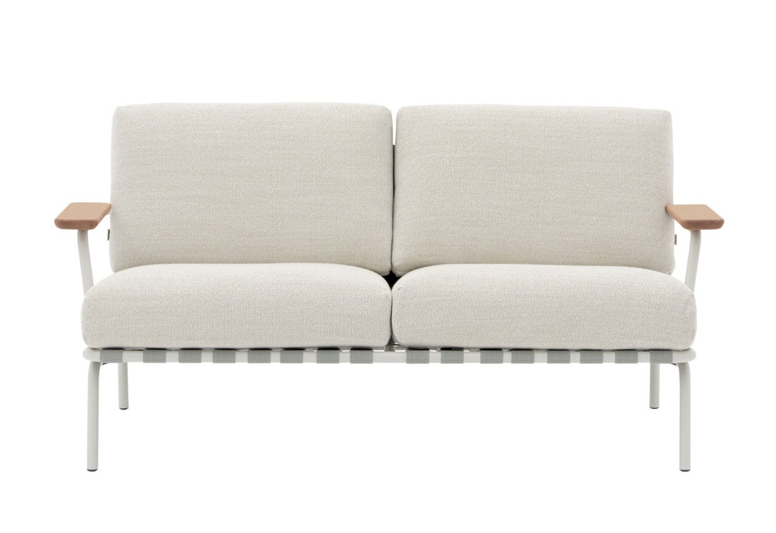 Settle Outdoor Sofa invites you to settle into its comfort, providing an ideal setting for enjoying the outdoors all day. Its airy steel frame, complete with visible belts and intricate details, enhances its visual allure from all angles, while its armrests, made from FSC™-certified (FSC-C028824) sapele mahogany wood, add a warm, tactile feel. Settle’s steel frame is galvanized, primed and powder-coated, ensuring corrosion resistance for long-lasting use. The plush cushions, made with quick-dry foam and durable outdoor textiles, offer fast-drying resilience in rain showers and year-round durability when used with an outdoor cover.