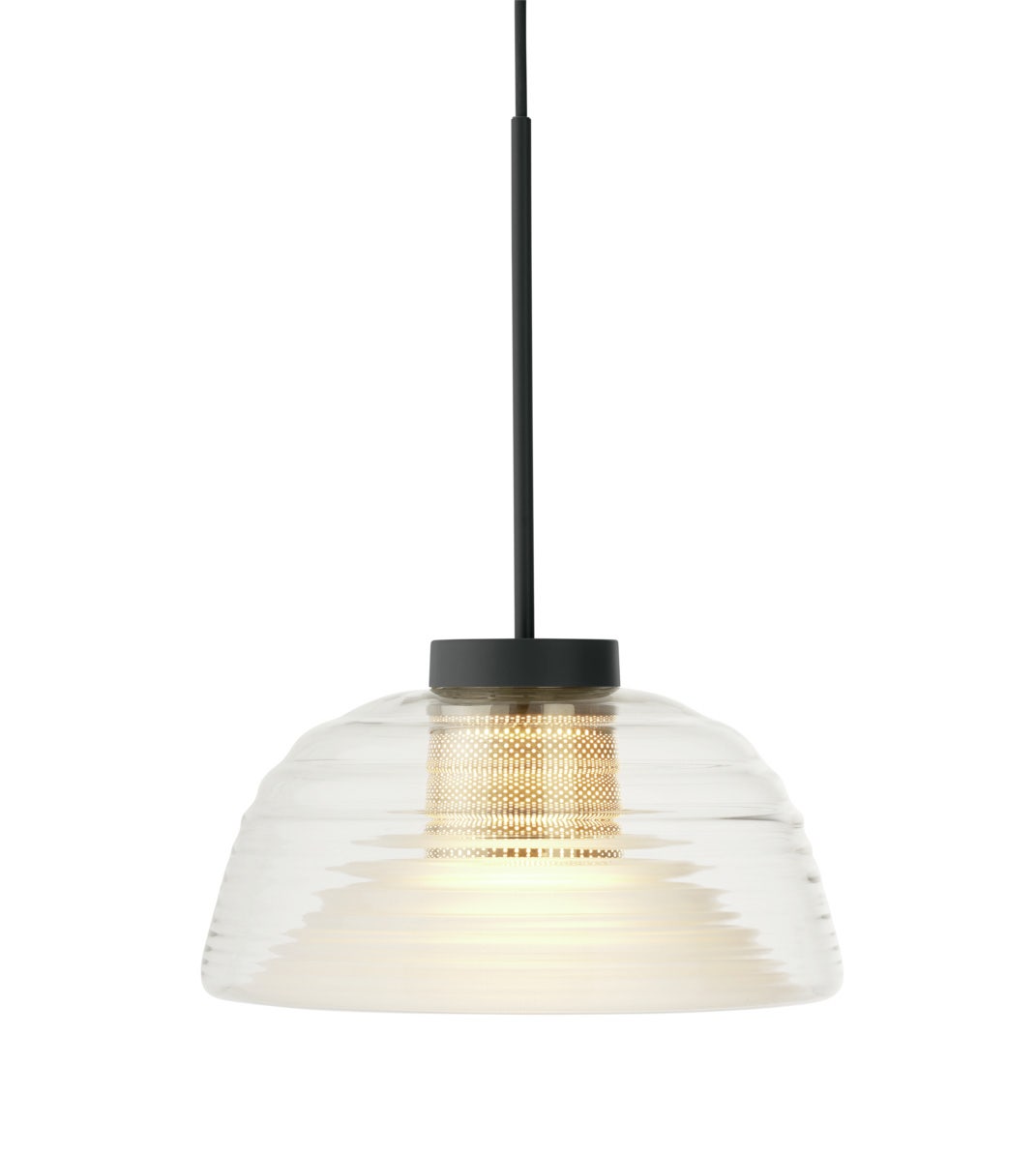 The Two-Layer Pendant brings new perspectives to the classic glass pendant with its rippled, mouth-blown glass, creating unique optical effects from different angles. This refined design combines clear and frosted glass with a punched steel mesh, providing ample, glare-free light. The blend of glossy and matte finishes creates a harmonious, sculptural form that acts as a self-illuminating sculpture. Perfect for dining settings or above counters, it adds visual intrigue and elegance to any space.