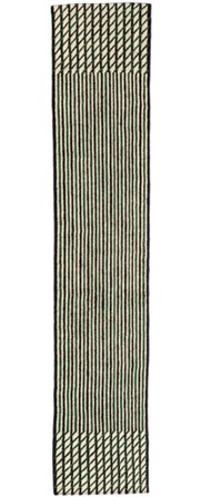 This blurred effect has been achieved by inverting the sense in which the kilims are traditionally woven, which makes the process much more laborious. This change in weaving causes the lines to be blurred, mixing two colours unevenly, creating an aged rug, reminiscent of the past.