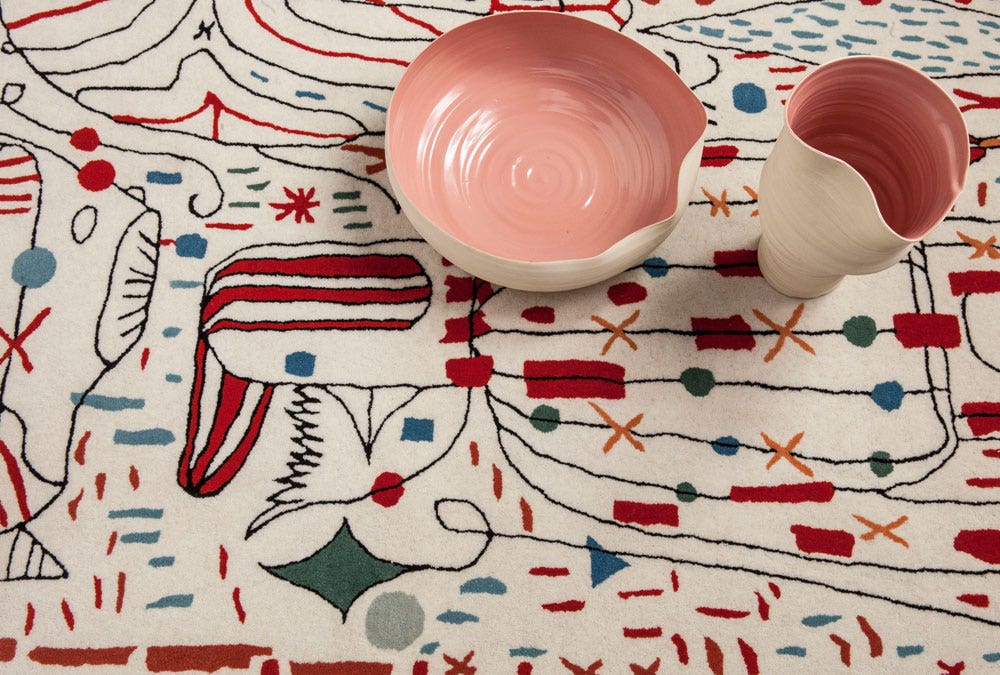 A first glance reveals a chaotic tangle of colours and shapes that invade the rug. However, after looking carefully, the imagination of Jaime Hayón springs to life: turtles, lips, hands, stools, fish, half men – half birds.