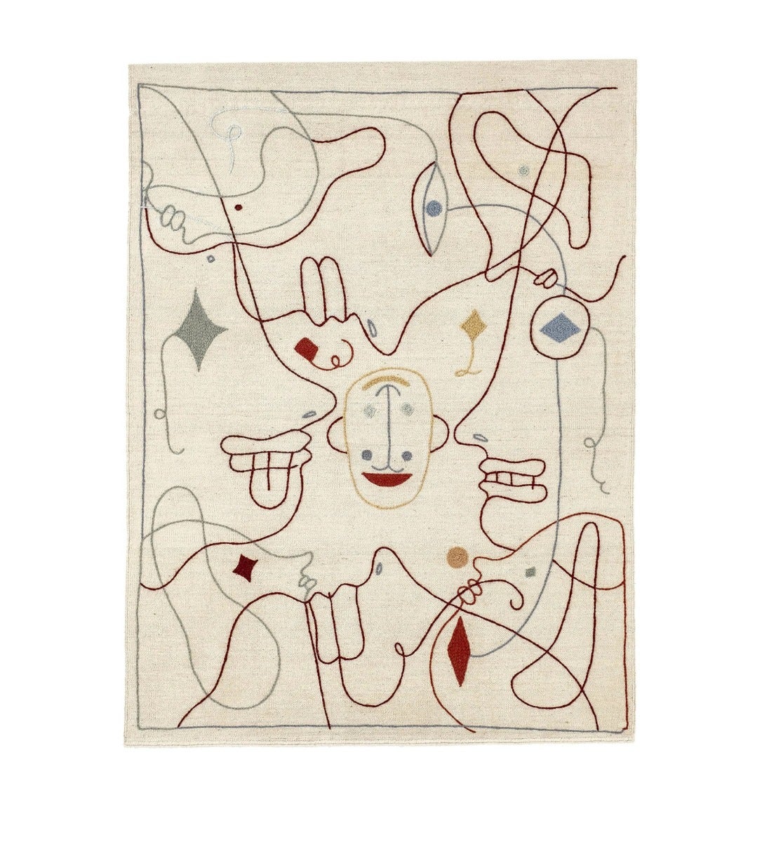 Depicted with a delicate stroke, the illustration defines the silhouettes of several imaginary characters that intertwine and coexist in a beautiful composition. Hayon subtly introduces color through small elements brimming with personality that help to interpret each of the images. Nine faces are distributed at different angles so that the rug can be viewed from any perspective, fitting perfectly in any space.