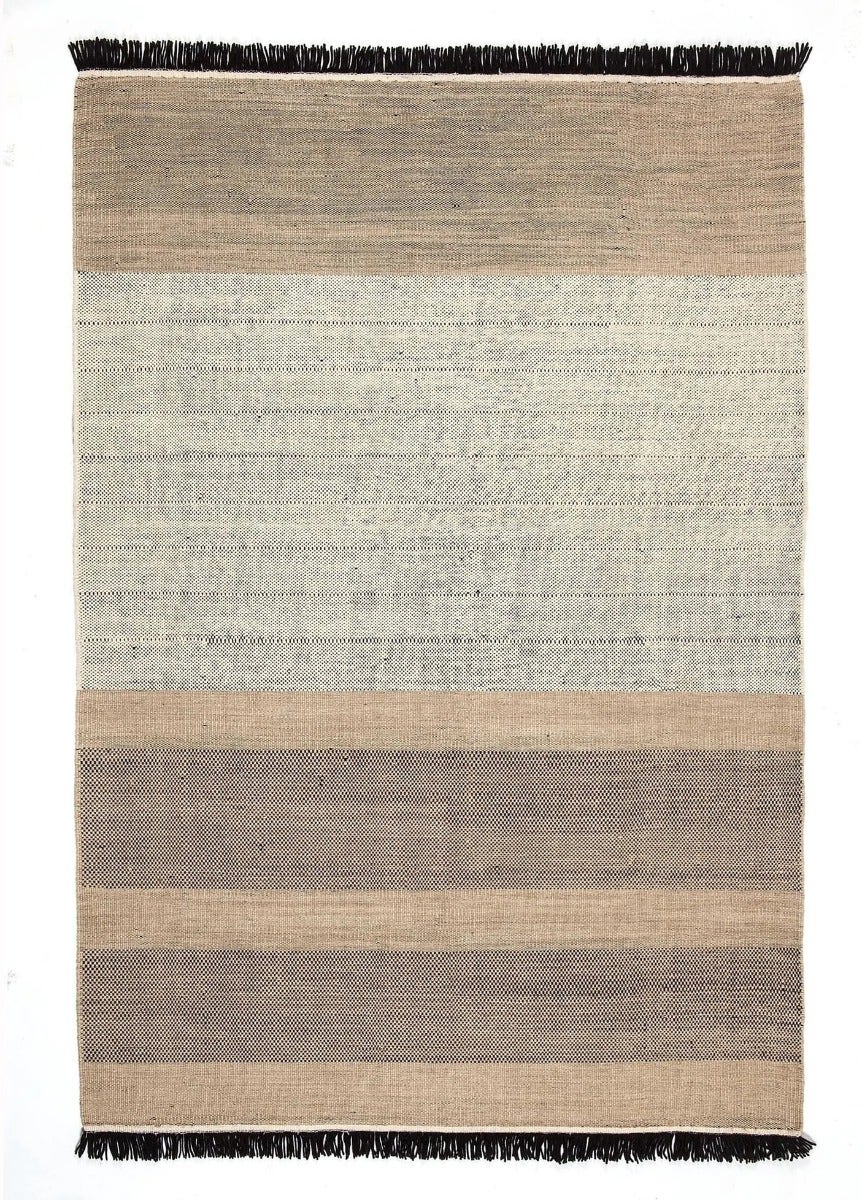 Tres is a traditional Indian flat-weave Dhurrie rug. Its unique quality lies in the production of three independent parts in which different fibres predominate. The proportion and combination of wool, felt, and cotton generate changes in tone and irregularities in the weave, bringing the pattern to life. The collection is an exercise in honesty, showcasing the weaving structure almost in a pedagogically style, without fear of revealing the warp. The fringes also help to understand the construction process thus enhancing the differentiation between the three pieces that finally blend together invisibly.