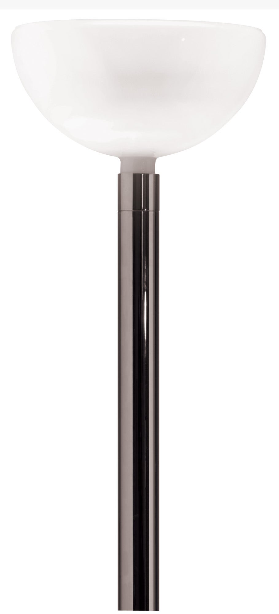 Floor lamp with chromed structure. Cup-shaped diffuser in opal white glass. Flood beam distribution, dimmer on the cable.