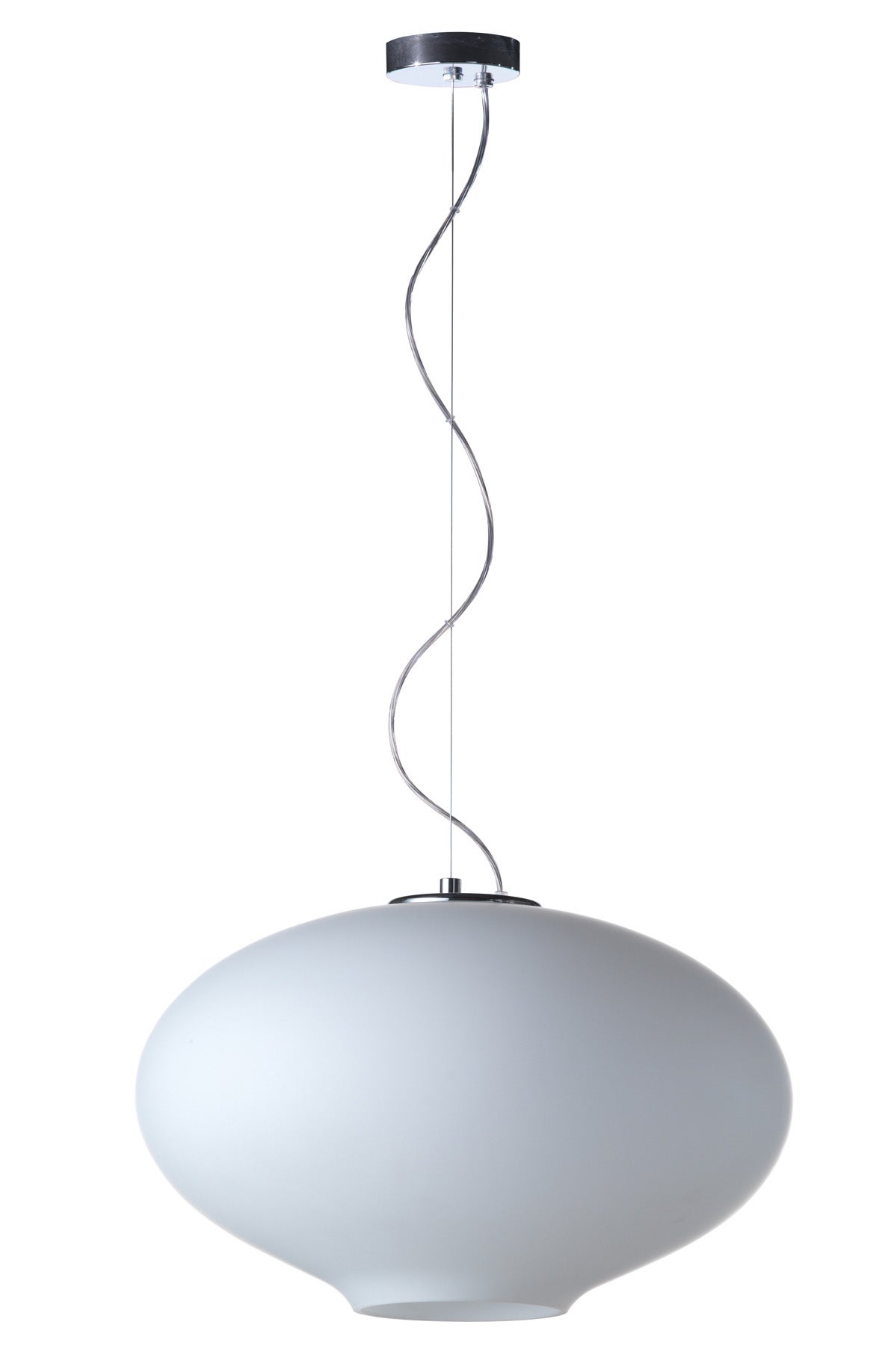 Large pendant lamp in triplex blown glass, opal white, with widespread light. Particulars in chromed metal.