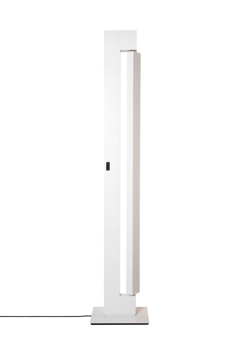 Family of floor and wall lamps, with fluorescent, LED and halogen sources depending on the version. It is composed by two elements in extruded aluminum: depending on versions, structure is painted in white, anthracite, champagne and moka, while the rotating illuminated structure can be glossy anodized or painted matt white or anthracite. The LED or halogen uplight source is integrated in the upper part of the structure and it creates a widespread light, while a fluorescent or LED source is integrated in the main structure for a widespread and adjustable light. The power supply is integrated for both versions while the dimmer is on the cable in the LED + LED version and integrated in the DTW version.