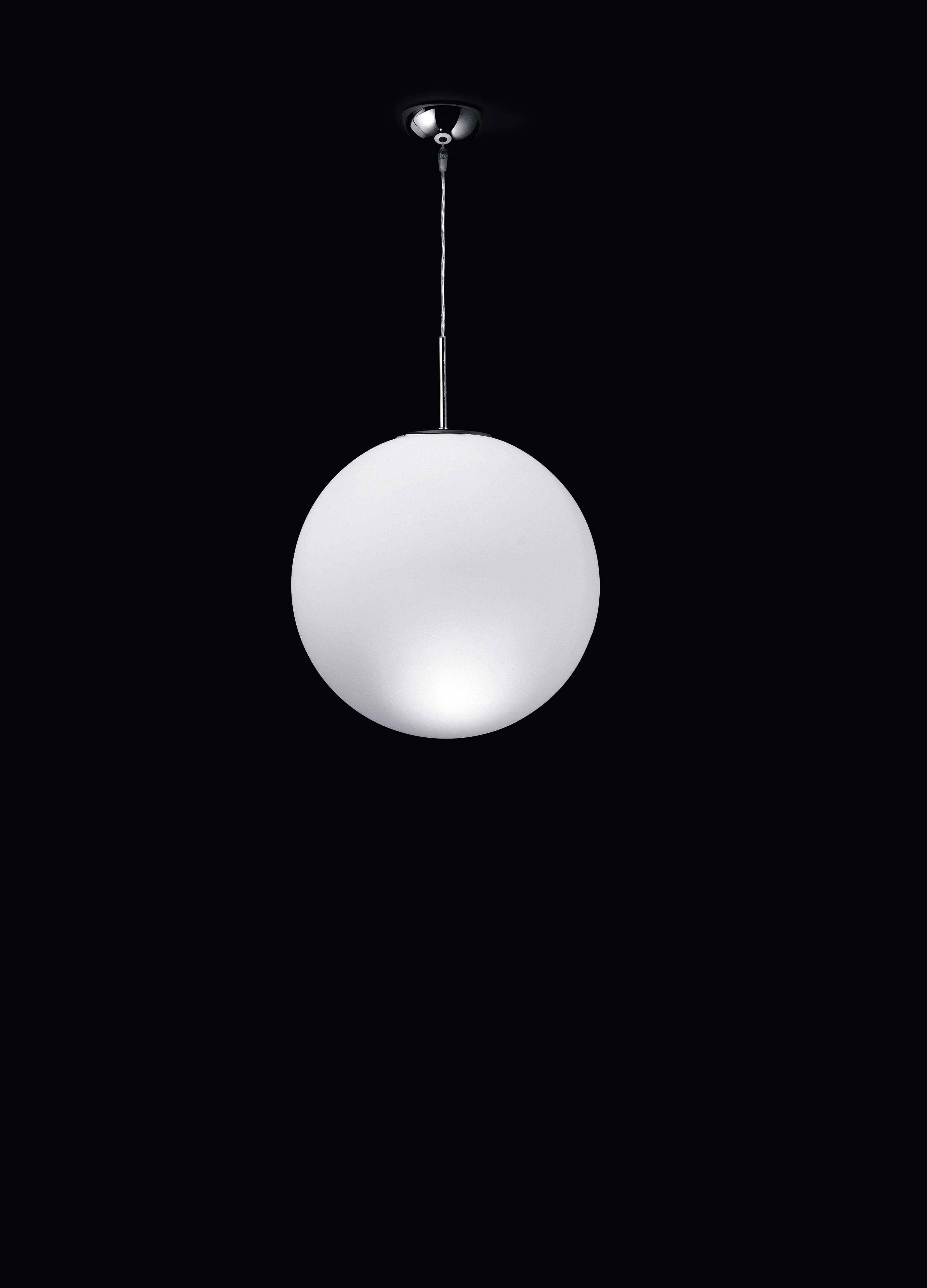 Pendant lamp in triplex blown glass, opal matt white. Metal parts chromed or painted in white.