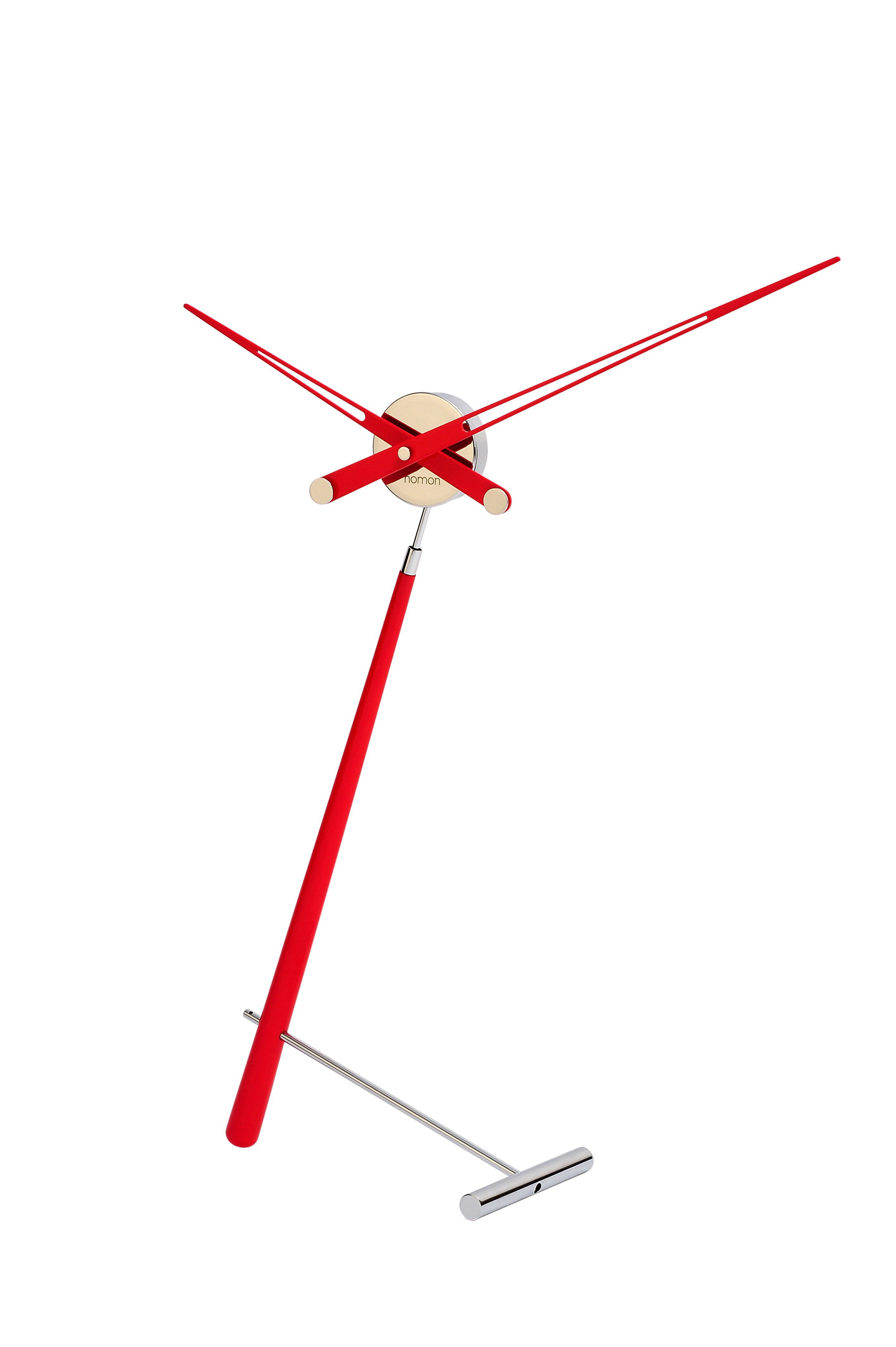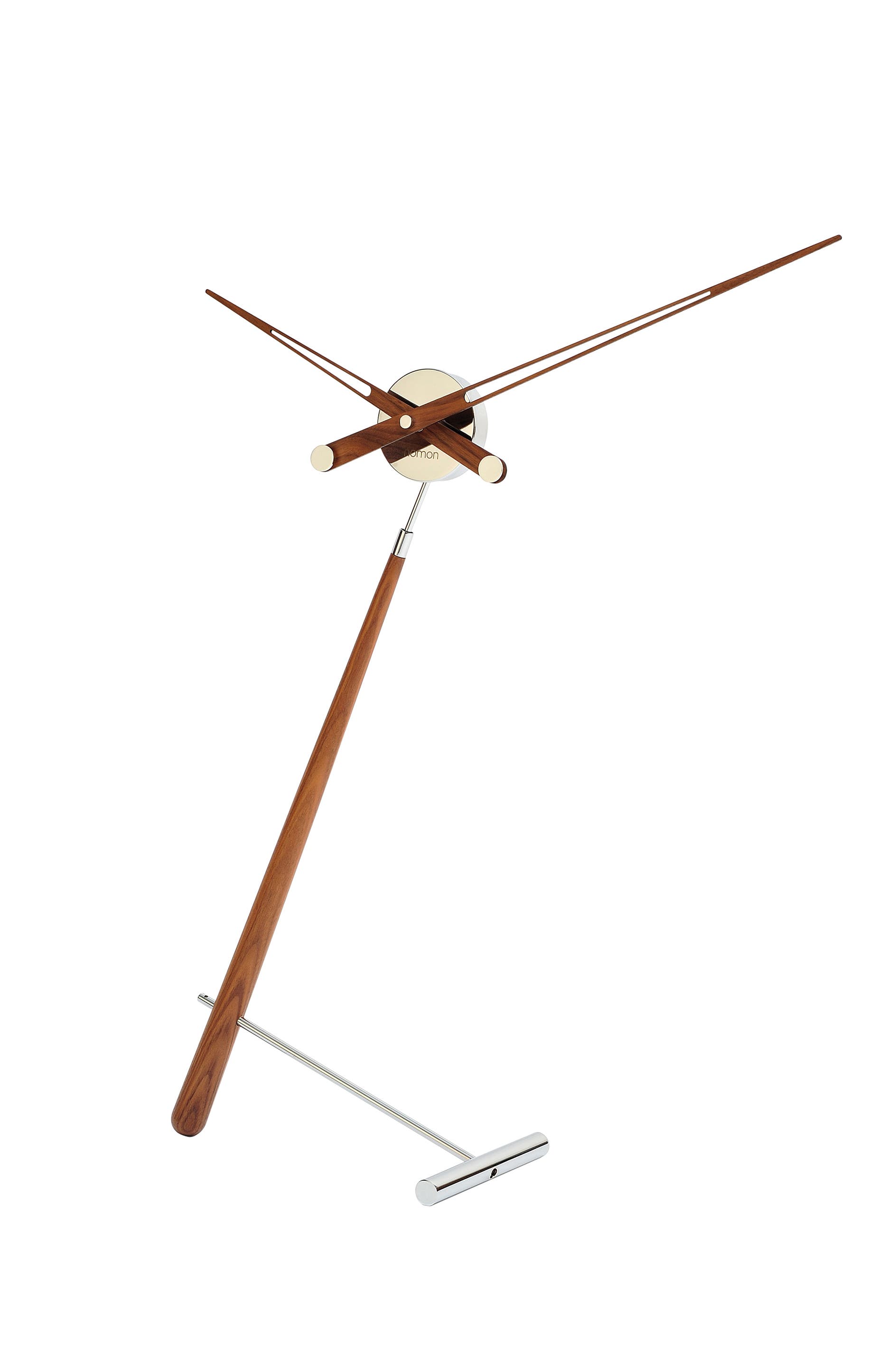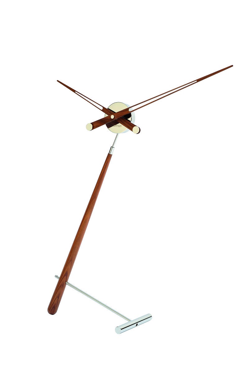 Asymmetrical sculpture perfect for adding a touch of personality to an office or side table. The clock with less clock-like appearance. Its hands move freely through the air, while the two supports travel in opposite directions. The large one is made of solid wood and the small one, which functions as a base, is made of metal.