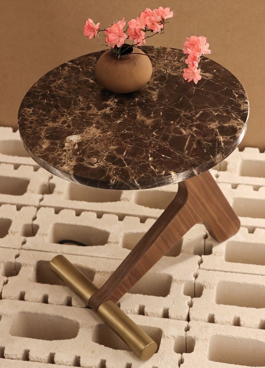 The Puntero side table is an interesting conversation piece formed by a single leg in walnut wood with brass details. The tabletop, in rich Italian marble, or wood, seems to be floating on the table’s perfectly balanced body. It is a beautiful statement piece and a great addition for any living space.