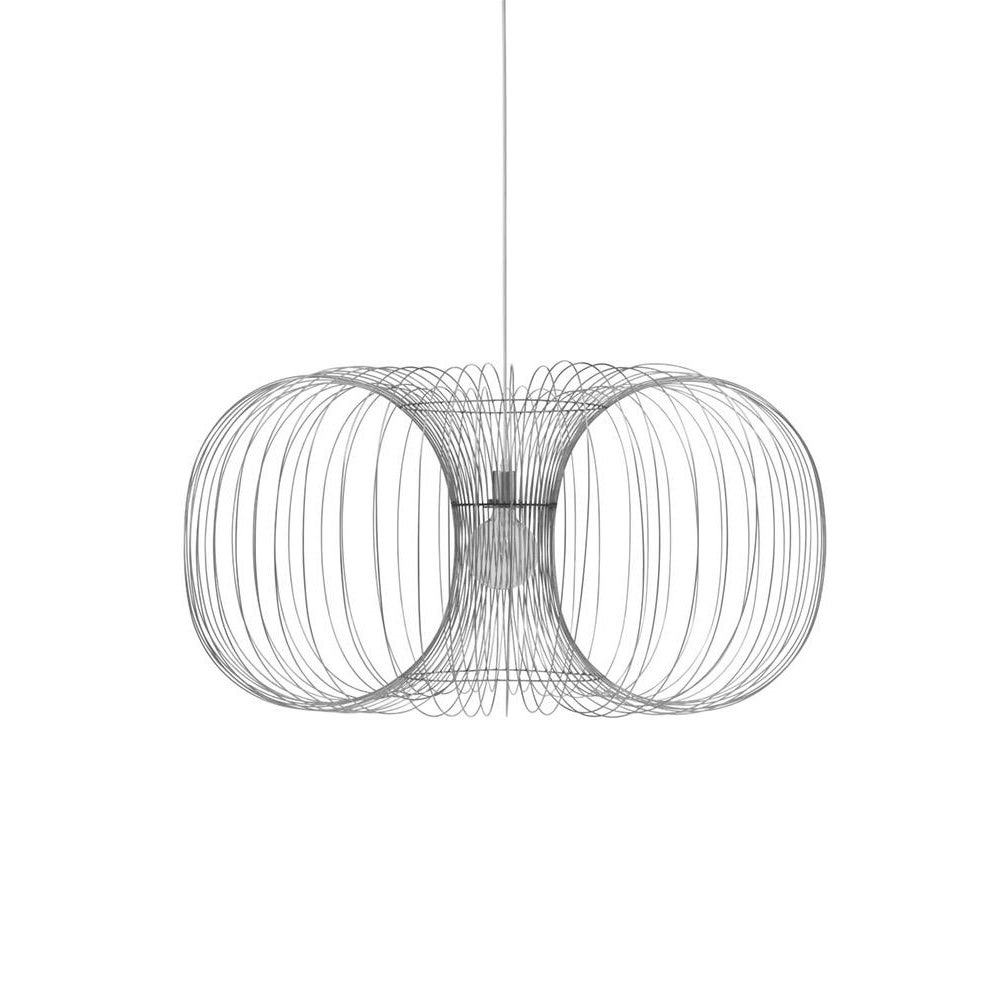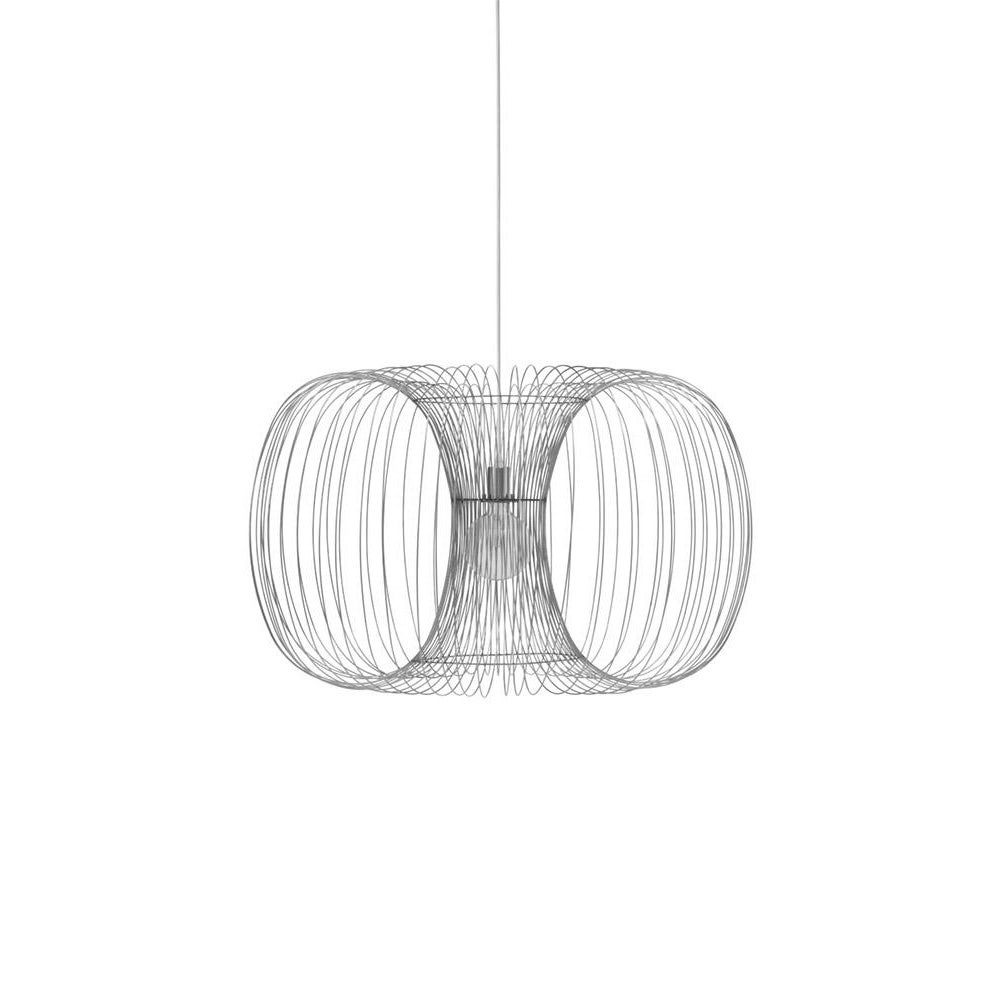 Coil is a pendant lamp collection characterized by its rounded rectangle shape created by curved stainless-steel wires. The pendant is very simple in its design but will become an aesthetic focal point in any setting. The collection is available in four different sizes, making it adaptable to both smaller residences and big, spacious environments.