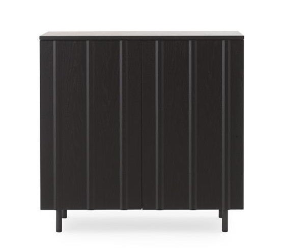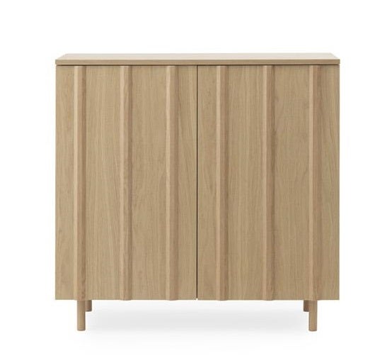 The design has trapeze-shaped solid oak slats, which create a visual break in the uniform surface of the front and add depth and dynamics. Rib has removable shelves that can be adjusted in height, giving the possibility to store any object or belongings.