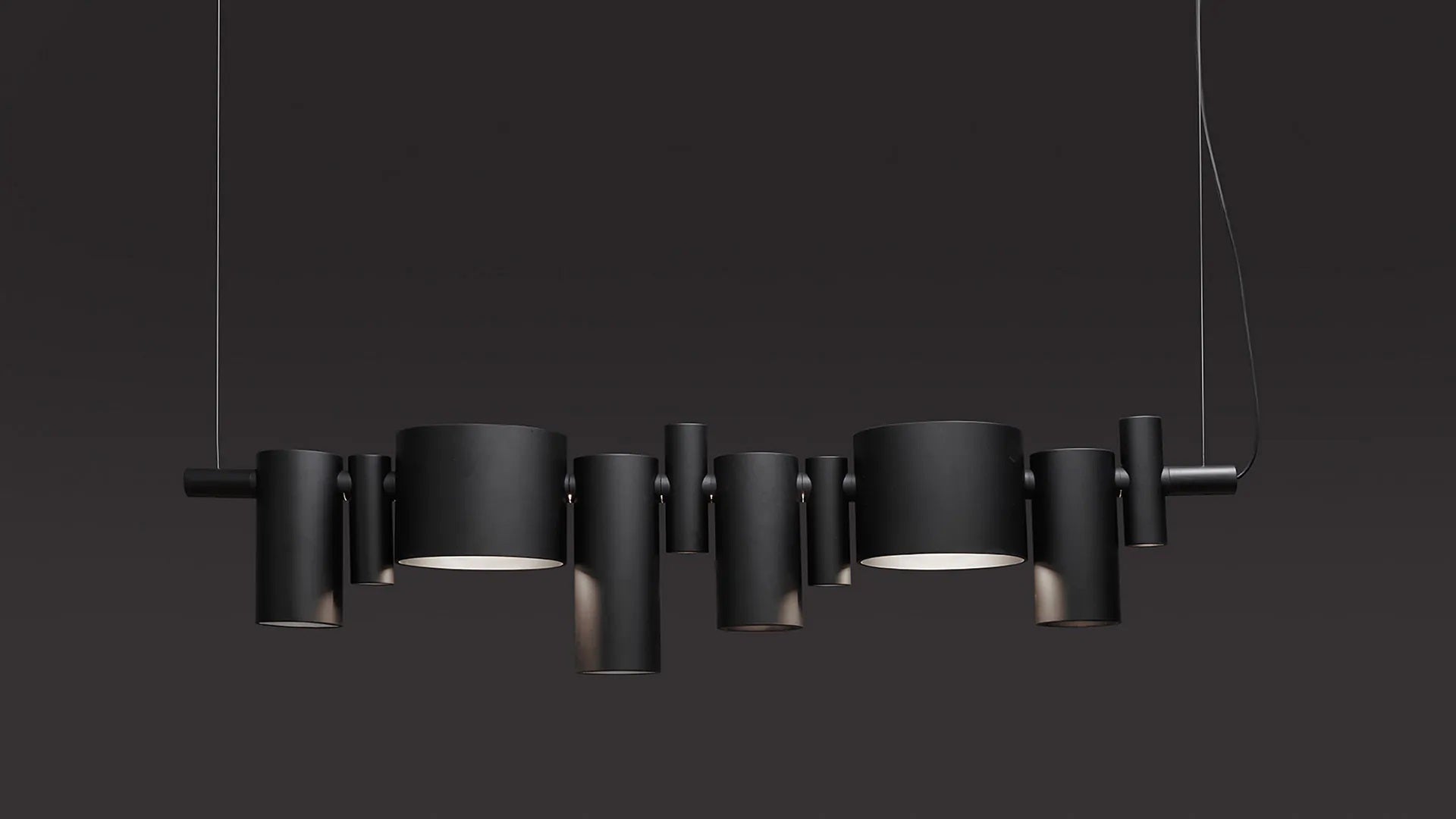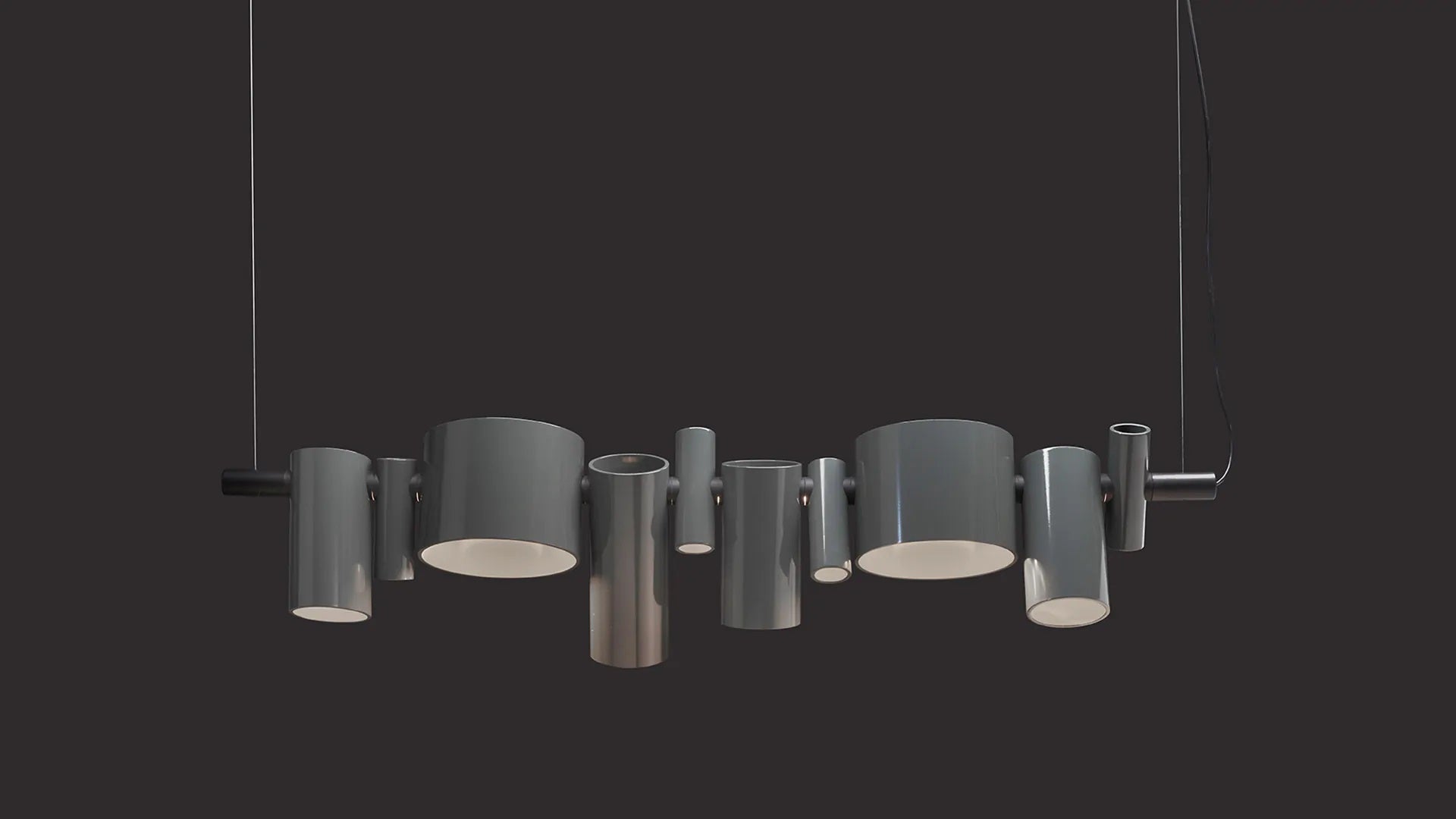 A decorative lamp with a techno soul. Dancing Queen is a suspension lamp with a flexible compositional structure that makes it possible to design different light layouts. The compositional element is a horizontally curved central body that encloses the light source and supports thin metal cylinders of different diameters conceived as adjustable spots.