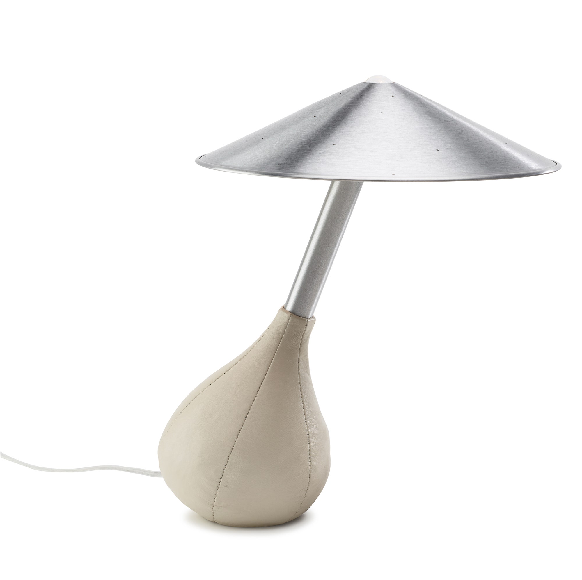 Piccola is limited only by your imagination. Its soft pliable base is covered in supple Italian glove leather and can be tilted to any angle while its handspun aluminum shade floats freely to remain level in all positions. It is as playful as it is intelligent. SF Moma permanent collection.