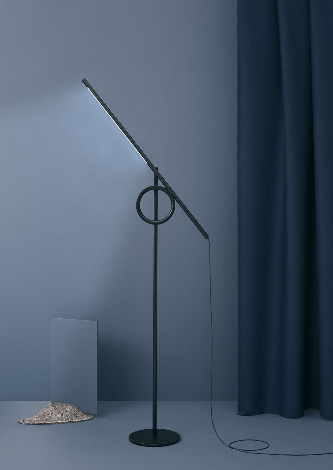 Tangent is an adjustable floor lamp inspired by geometric principles. The form and simplicity of the lamp’s mechanism gives it a sculptural quality that invites you to interact and explore its function. The lamp consists of two main elements: A linear LED with an integrated dimmer is contained in the light tube. This interacts with the ring of the free standing pedestal through the combination of tension, friction and balance allowing the user to create whatever functional or aesthetic lighting effect is desired.