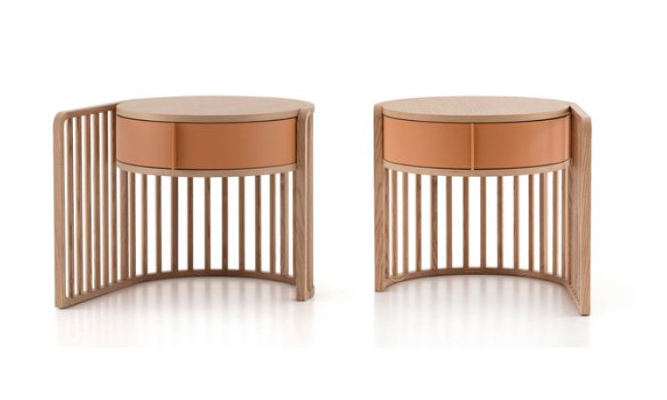 The rustling of the wind echoes in the silence of nature: a visual reference to canes, creating light, evocative and reassuring pieces of furniture. The new Palù collection portrays a concept of small-scale architecture, formed from the relationship between presence and absence. The distinctive features of these complements, a bedside table and bench seat, are the linear effect of solids and empty spaces, and profound harmonies. The curves created using a sequence of wooden rods define the space, indicating the sense of the limit in a neat and feminine series. The frame embraces suspended volumes, made out of air: an upholstered seat, a Vienna straw shelf, elegant drawers. In the bedside table, the round drawer rotates towards the bed, transforming into a second shelf.