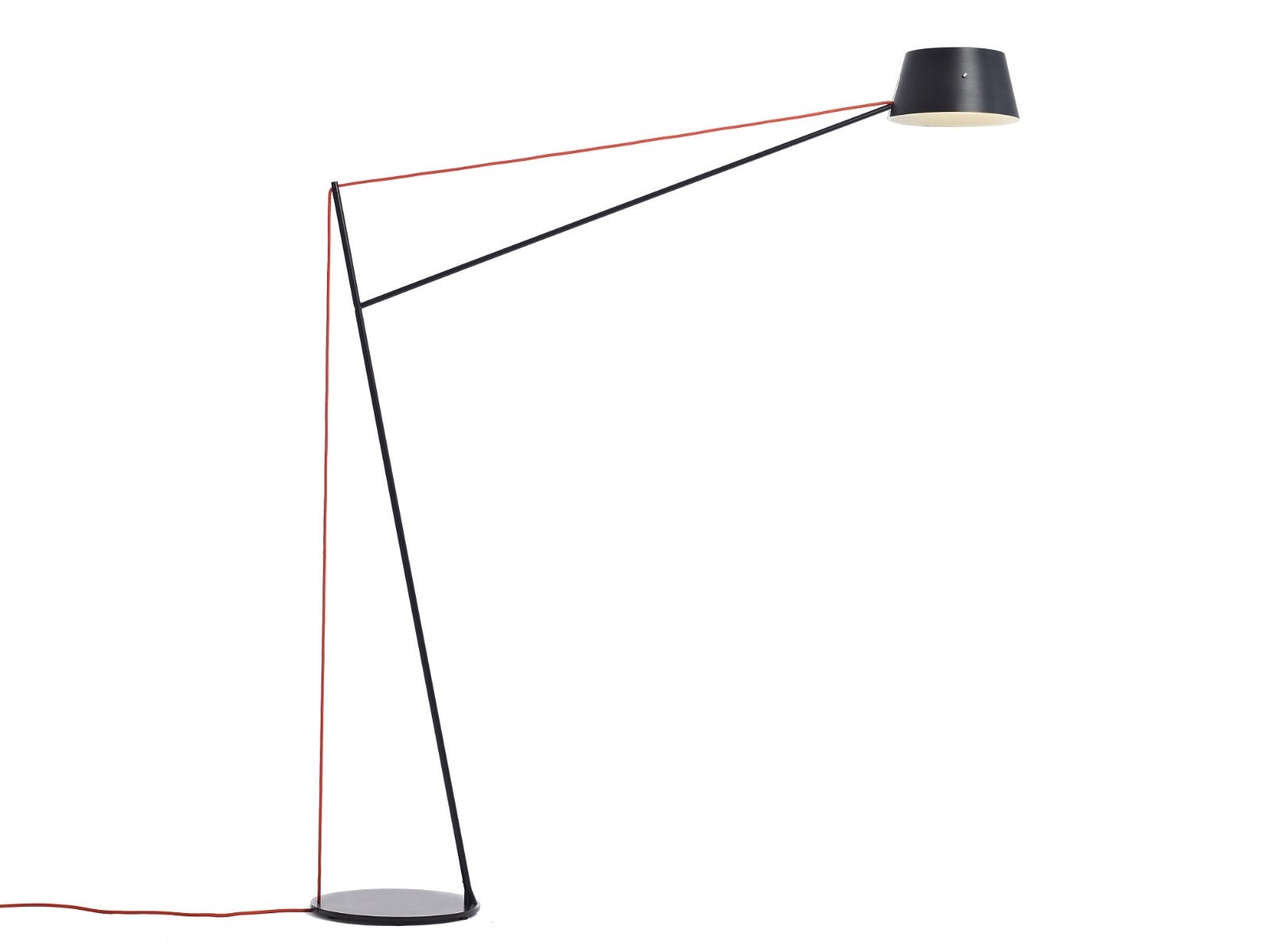 With a simple two-dimensional silhouette that relies on a tensioned electrical cable for support, it has a spun aluminum shade that rotates 360 degrees allowing for the light-source to be directed accordingly.