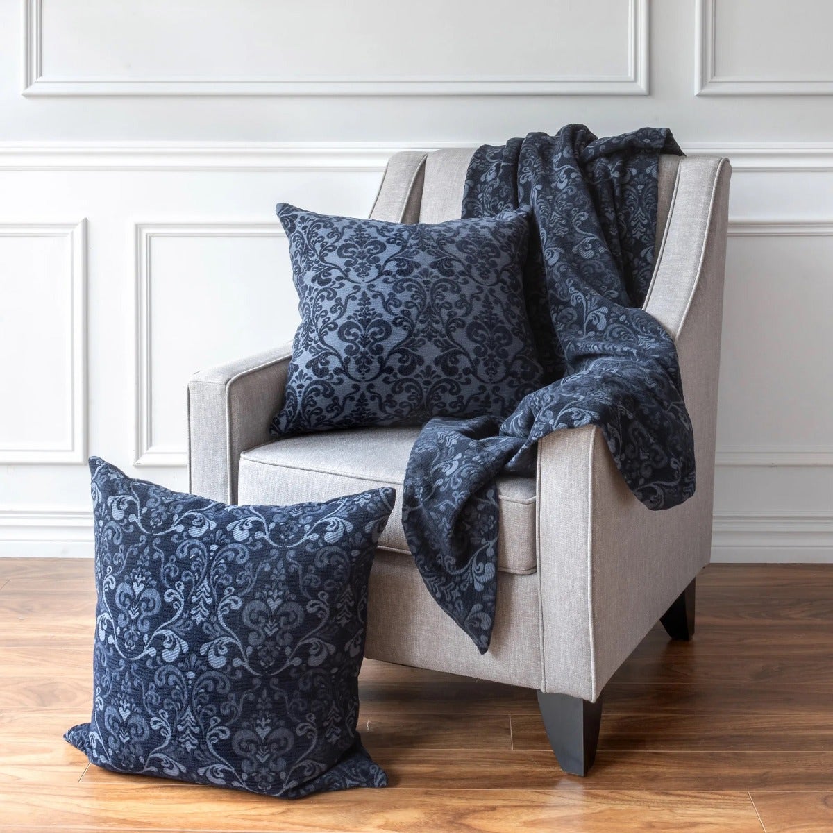 Royce creates a mood that is both bold and enticing. The intense navy colour exudes strength and confidence, while the rich, soft texture invites you to curl up on a cold day. Fine long-staple cotton and viscose are woven to create an artisanal jacquard chenille that is ultrasoft and substantial. A Royce throw or cushion is the perfect accent in any living room.