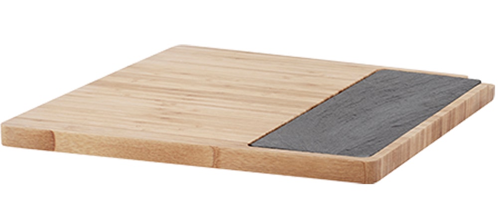 The Twin serving tray is a clean, simple and timeless design available in two sizes. The combination of slate inserted into wood makes TWIN ideal for smaller hot dishes and for serving cheese and sausages. Use the tray for cutting and serving at the buffet or dining table. TWIN is made from sustainable oiled bamboo and grows even more beautiful over time. Remember to treat your trays with mineral oil before use and on a monthly basis to keep the wood from cracking and warping.