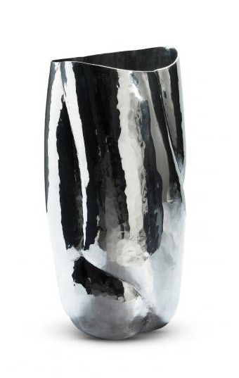 Cloud is a sculptural tall vessel made of highly reflective polished aluminum. Handmade in India by skilled artisans, each vessel has unique qualities with every hammer and indentation from stretching and warping the metal being preserved, reflecting the amount of work that’s gone into the design. This watertight silver vessel can be used as a vase and has a shape reminiscent of seedpods.