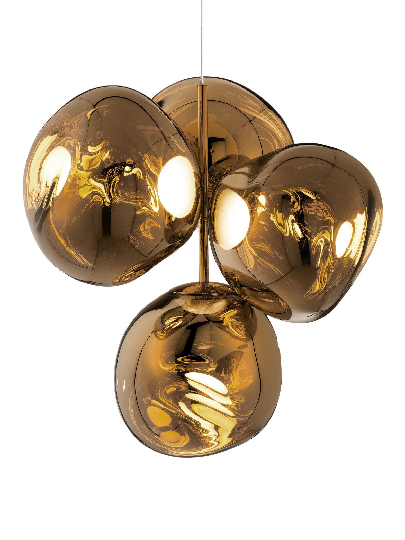A swarm, huddle, herd, cluster or bunch; there are a thousand ways of configuring our lamps to produce an extraordinary lighting arrangement. The latest addition to the Melt family includes the small chandelier, featuring four orbs protruding from steel tubes and is one metre high.