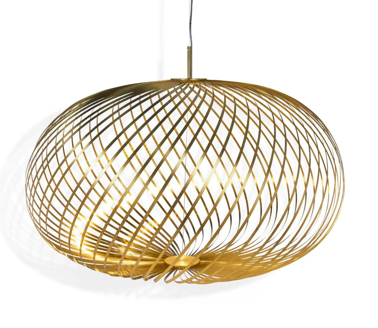 Spring is a series of three pendant lamps made up of stainless-steel strips. Pliant ribbons of stainless steel have been arranged like a whisk around our custom-made Tom Dixon LED ring. The semi-transparent shape thus created can be adjusted to a variety of silhouettes - from a flat arrangement reminiscent of a spirograph drawing, to a flying saucer configuration, and on to a fuller shape akin to a pumpkin. The shades are made from multiple bands of high-performance spring steel plated in an attractive brass finish. The nature of the spiral design allows the voluminous shades to be easily flat-packed for transportation.