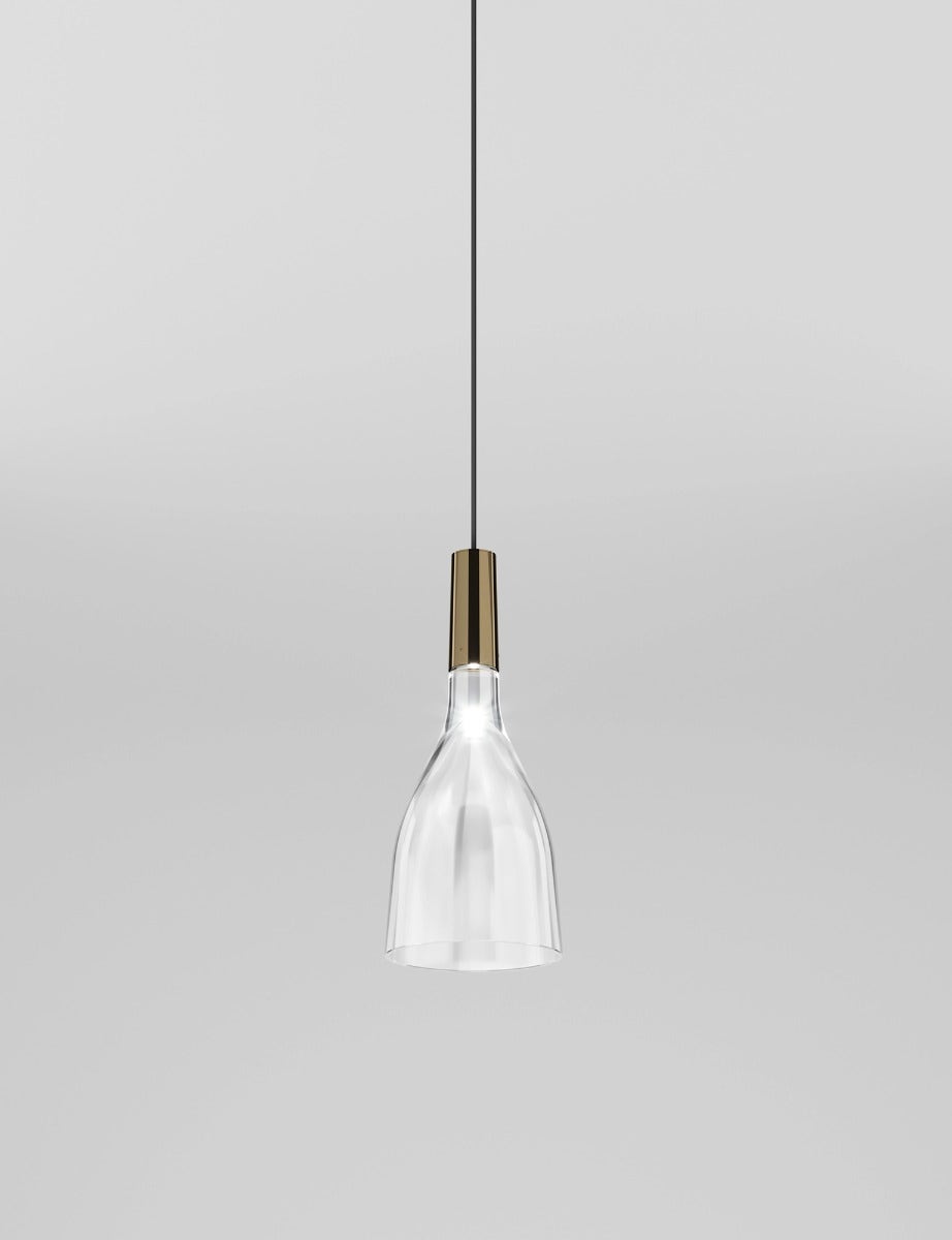 Scintilla has a classic, timeless shape. The LED light source illuminates the curved silhouette, creating effects of light and emotion thanks to the full bottom of the glass. The collection has been enriched with a new pendant model with a larger diffuser, which also allows for single installations that guarantee a wide diffusion of light.