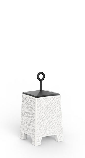 The NOMA collection, designed by Javier Mariscal for the Spanish brand VONDOM, is a group of outdoor items. There was an aim to create a new typology of furniture by combining the functions of a flowerpot and an outdoor table, and thus NOMA was born, a collection characterized by its originality and versatile nature. By asking the question “how do we sit down?” three different versions arose that could be adapted into three different environments: one for a chill-out scene, Low, completed with a very comfortable pouf out of the same collection; another to be used when seated in a chair or armchair, Medium; and another for a standing position or when sitting on a stool, High, ideal for the pleasure of enjoying a cup of wine outdoors. The first sketches showed natural shapes, which as the project developed leaned towards more architectural shapes that call to mind a column with a capital or a corbel.