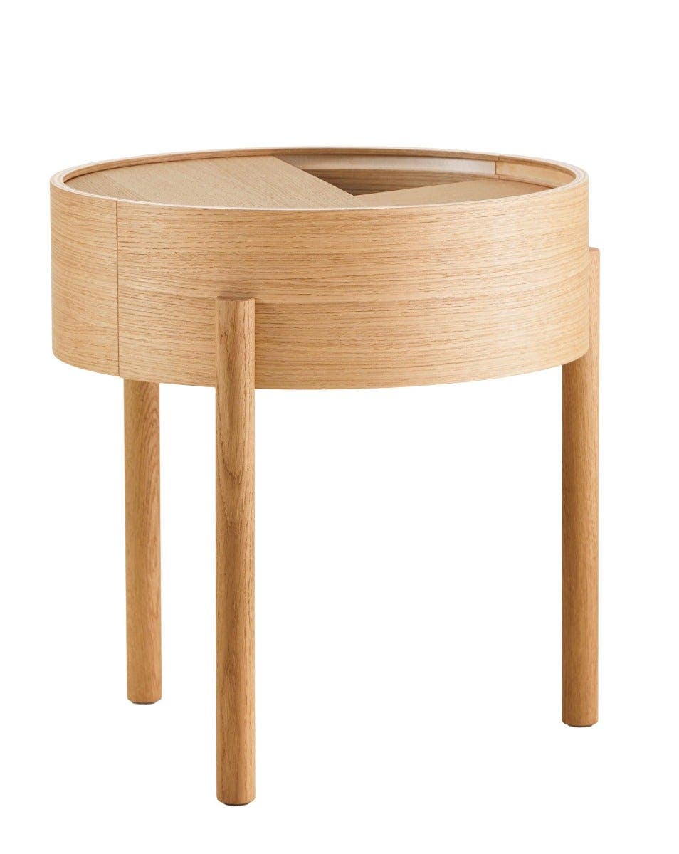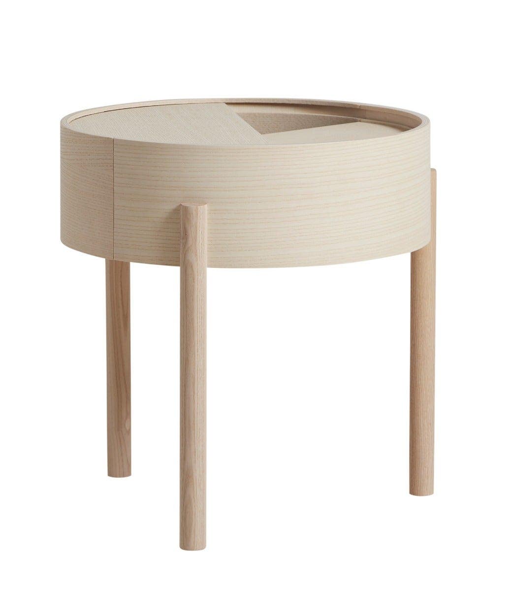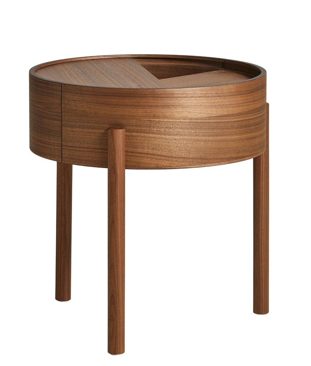 The Arc table invites its user to make use of the simple functionalities, use one finger to turn the upper tabletop. Let it be open with your favourite objects on display or close the lid to hide your mess. The surface on the inside storage space is covered with a smooth nanolaminate to complement the wood while the three-legged construction adds a playful and light touch to the geometric shaped design.